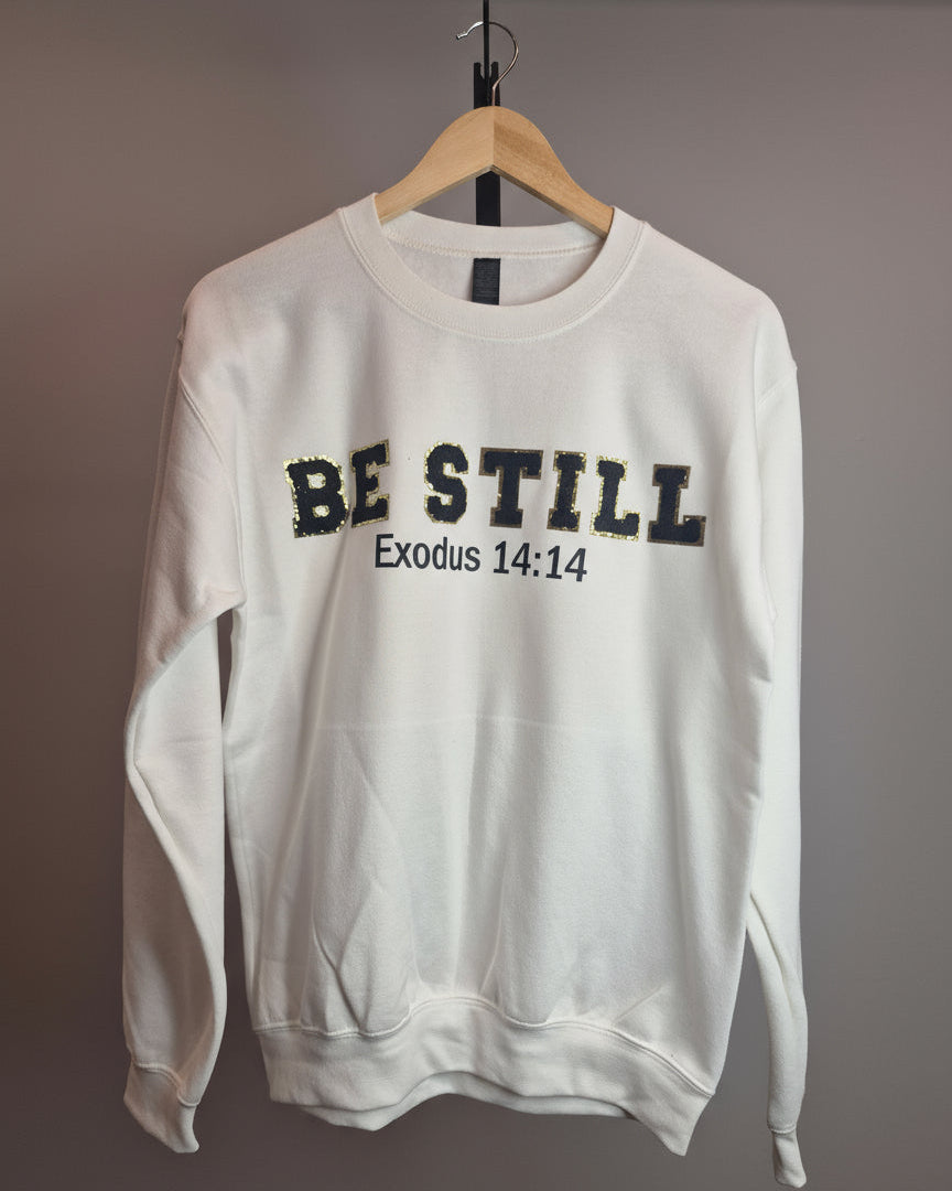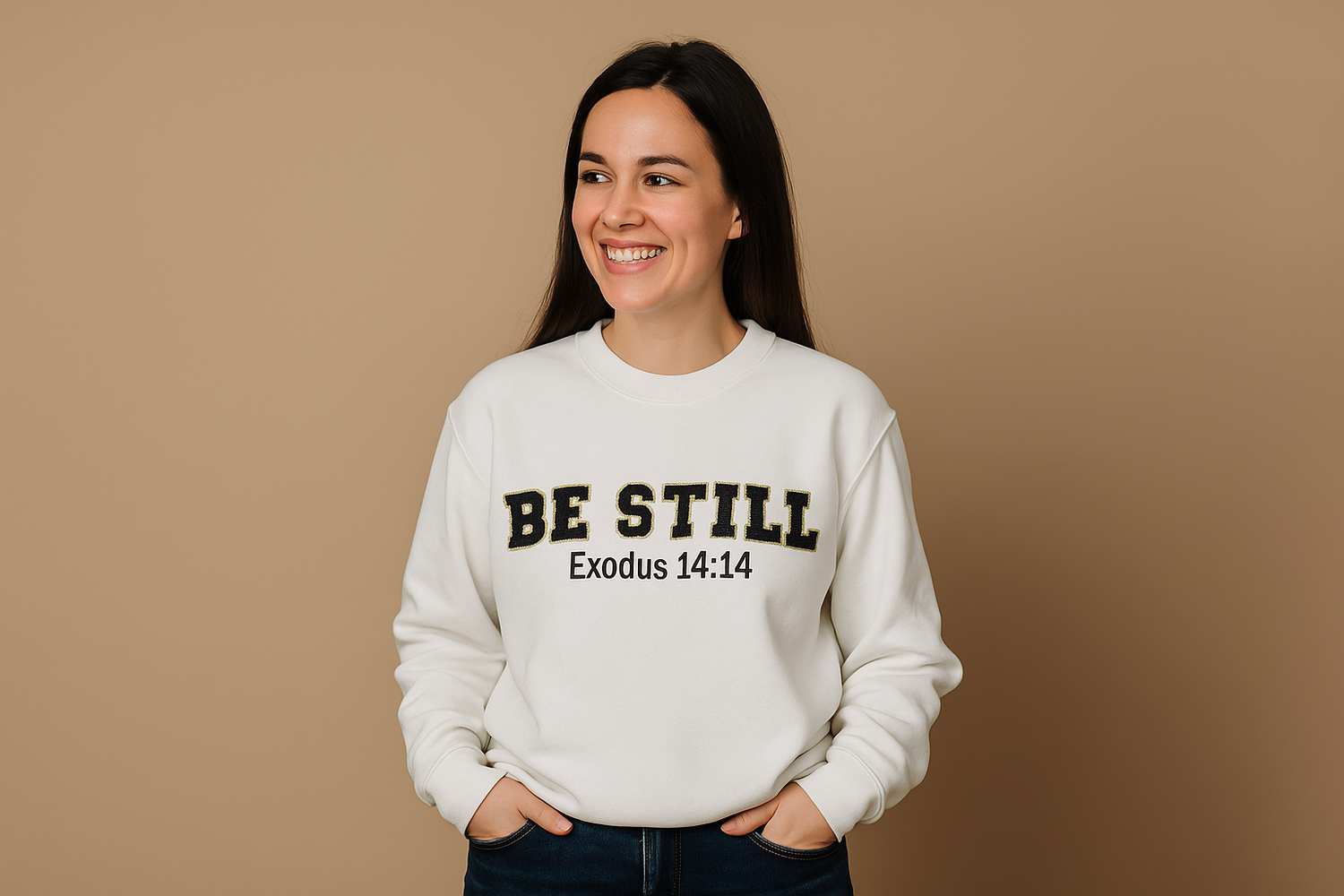 A simple, heartwarming moment — a girl smiling softly while wearing the “Be Still” Sweatshirt. Her peaceful expression reflects the verse from Exodus 14:14: “The Lord will fight for you; you need only to be still.” This sweatshirt captures the beauty of calm faith and quiet confidence, reminding every woman that strength often begins with stillness.