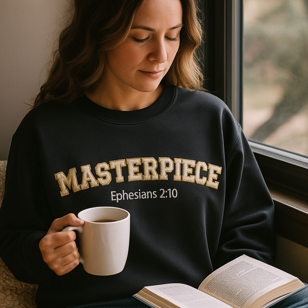 A woman sits peacefully reading her Bible, wrapped in comfort and grace. The “Masterpiece” sweatshirt reminds her — and every woman — of God’s beautiful truth: “For we are His workmanship.” Soft, warm, and meaningful, it’s more than apparel — it’s a reflection of purpose and faith.