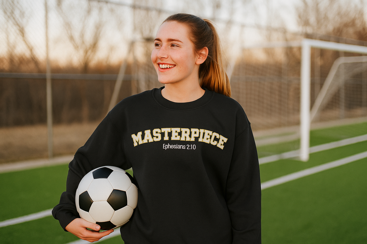 A girl playing football in her Masterpiece Sweatshirt — confident, joyful, and unstoppable. Designed for movement and comfort, this sweatshirt represents the perfect blend of faith and strength, showing that you can honor God’s work in you both on and off the field.