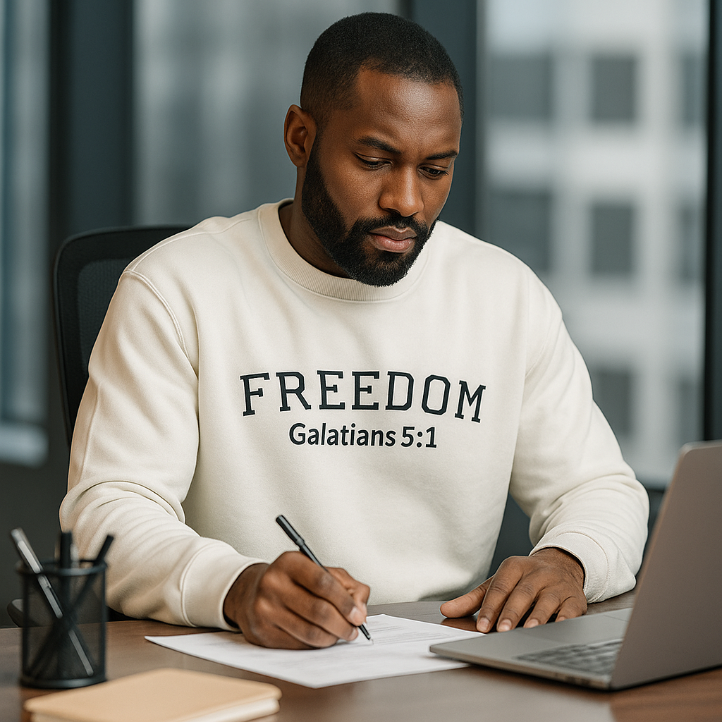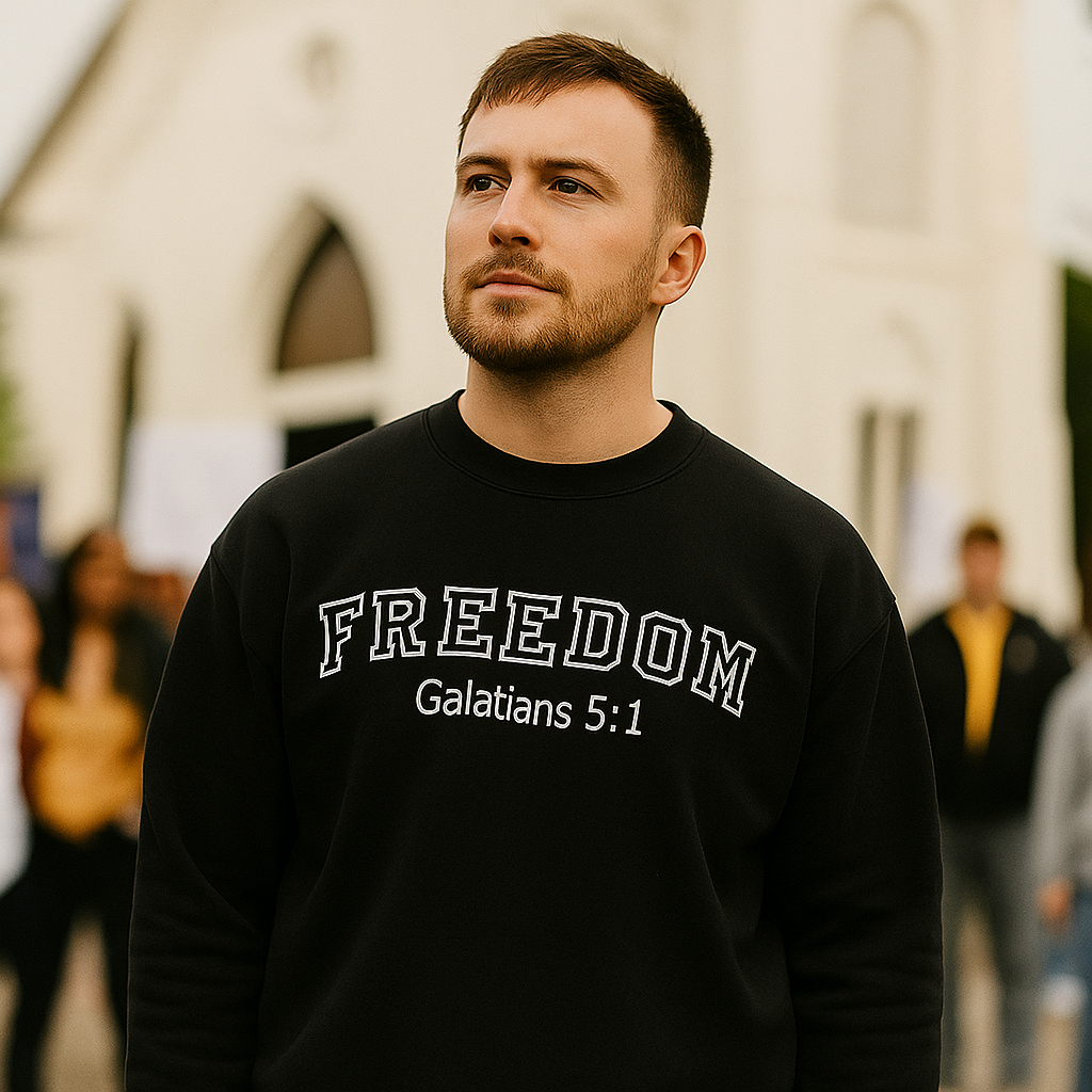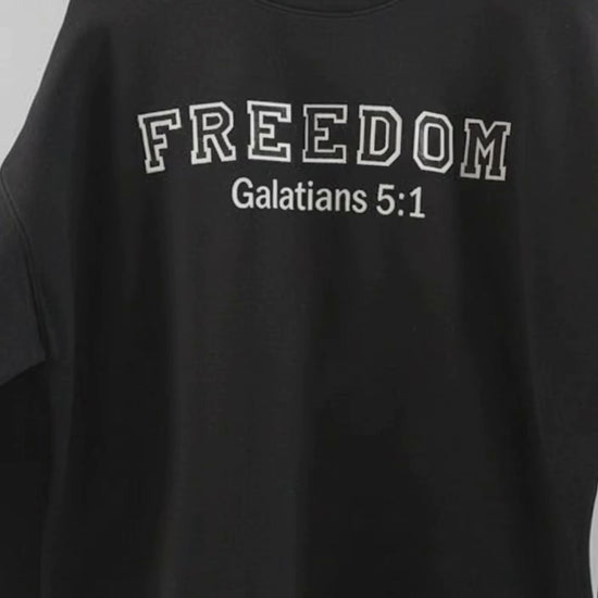 Celebrate true freedom with our Galatians 5:1 Chenille Patch Sweatshirt. Designed for both men and women, this cozy unisex sweatshirt features a bold chenille “Freedom” patch inspired by the verse “It is for freedom that Christ has set us free.” Soft, stylish, and faith-driven — it’s perfect for expressing your beliefs with confidence and comfort.