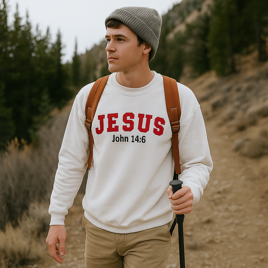 Conquer new heights with purpose. Our Unisex Sweatshirt with bold red “JESUS” lettering keeps you warm and motivated as you hike through the hills. Built for comfort and strength, it’s a perfect companion for those who carry faith wherever their journey leads.