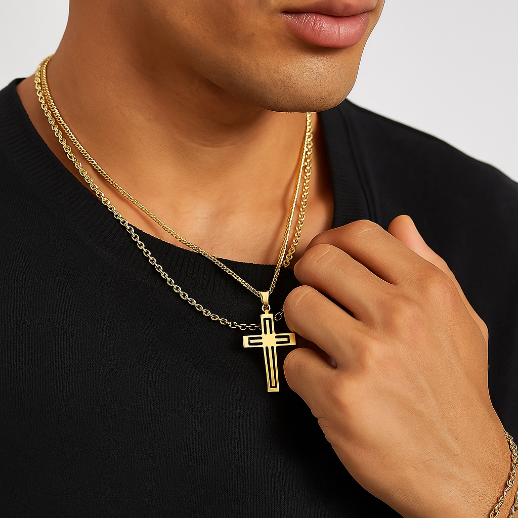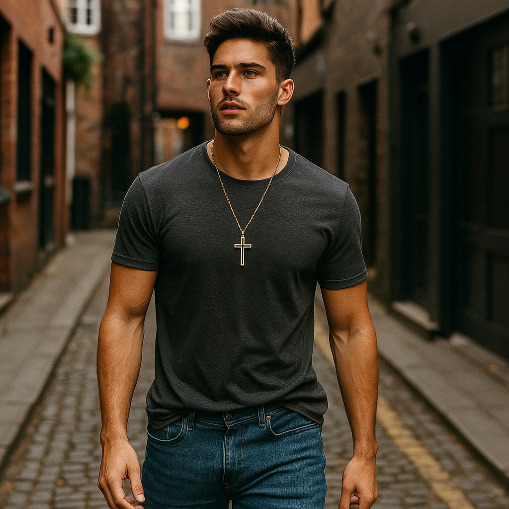 Step out with confidence and subtle elegance. This men’s cross necklace adds a touch of faith-inspired style to your everyday streetwear, making a bold yet refined statement wherever you go.
